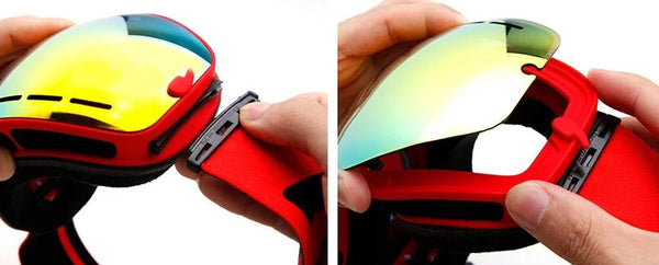 The exchangeable lens system provides spare lenses with different colors, suitable for different weather conditions and personal preference when skiing, snowboarding or other winter sports.