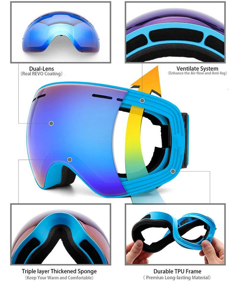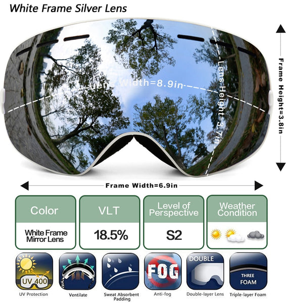 The ski goggles allow you to wear your glasses under the goggles. There is no problem if you wore myopic or hyperopia glasses.The anti-fog and anti-scratch coated with 100% UV Protection inner double layer lenses give you a FOG FREE environment while you are enjoying a snowy day.